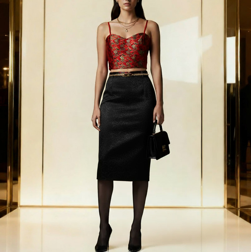 ستش کن با دامن مشکی راسته یا ماکسی از جنس کرپ مازراتی.